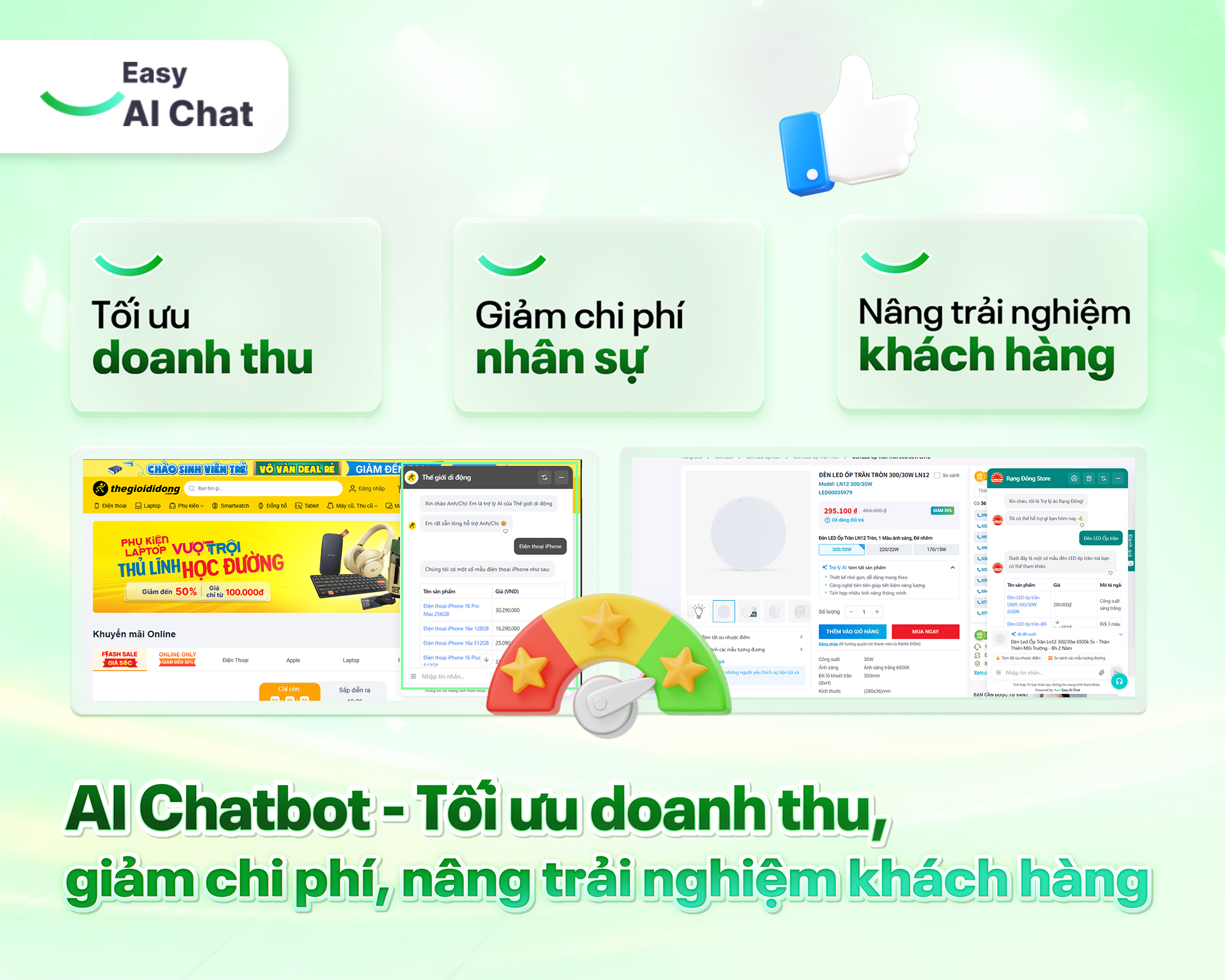 Đầu tư vào AI Chatbot mang lại ROI rõ ràng: mỗi AI Chatbot có thể thay thế khối lượng công việc tương đương 5-10 nhân sự mới (tùy theo quy mô doanh nghiệp). Nhờ vậy, chi phí vận hành giảm đáng kể nhưng hiệu quả chăm sóc khách hàng vẫn được đảm bảo tốt nhất.