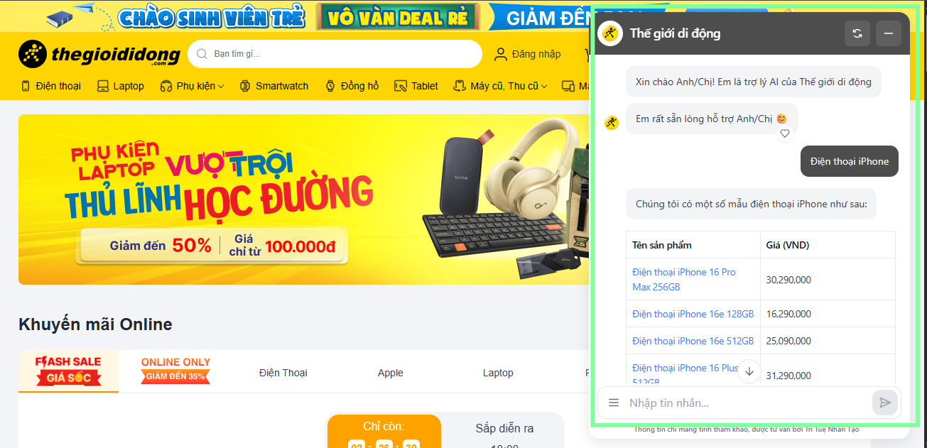 AI Chatbot Thế giới di động cập nhật giá bán sản phẩm tức thì