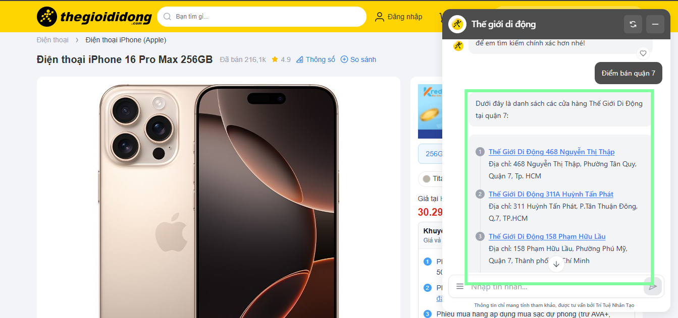 AI Chatbot Thế giới di động tư vấn điểm bán hàng gần nhất theo vị trí khách hàng